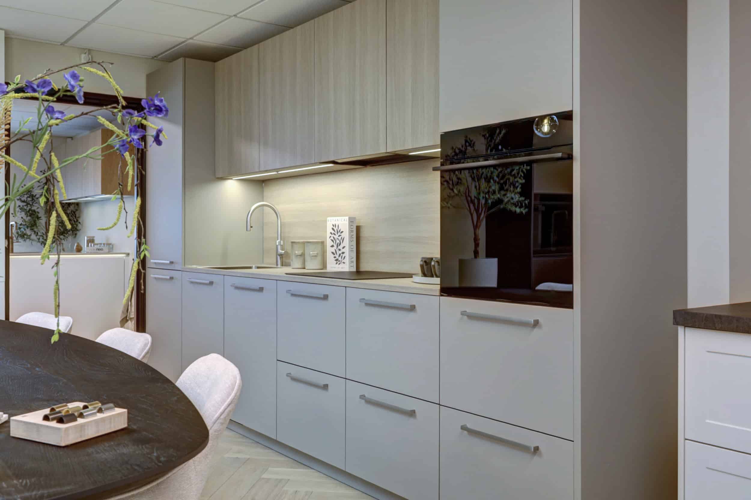 Wit is en blijft een populaire keuze, vooral vanwege de frisse, ruimtelijke uitstraling. Maar een moderne keuken hoeft zeker niet wit te zijn. Ook kleuren als lichtgrijs, zwart, taupe of zandtinten worden vaak toegepast. En wie wat meer lef heeft, kiest voor een groene keuken of verwerkt houtaccenten voor extra warmte. Het strakke ontwerp blijft, maar de kleur bepaal je helemaal zelf.