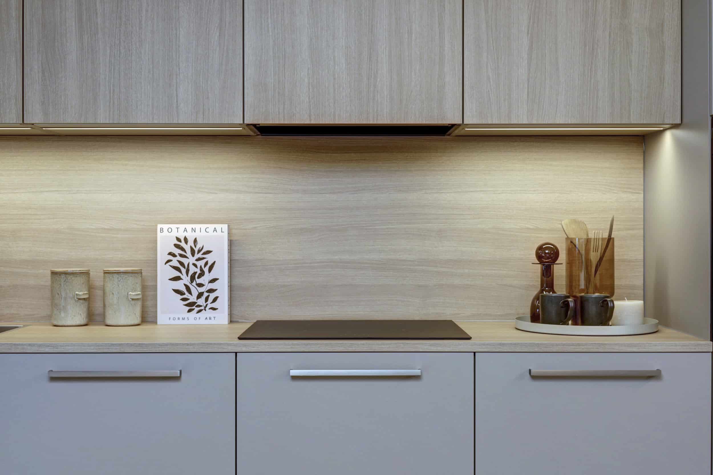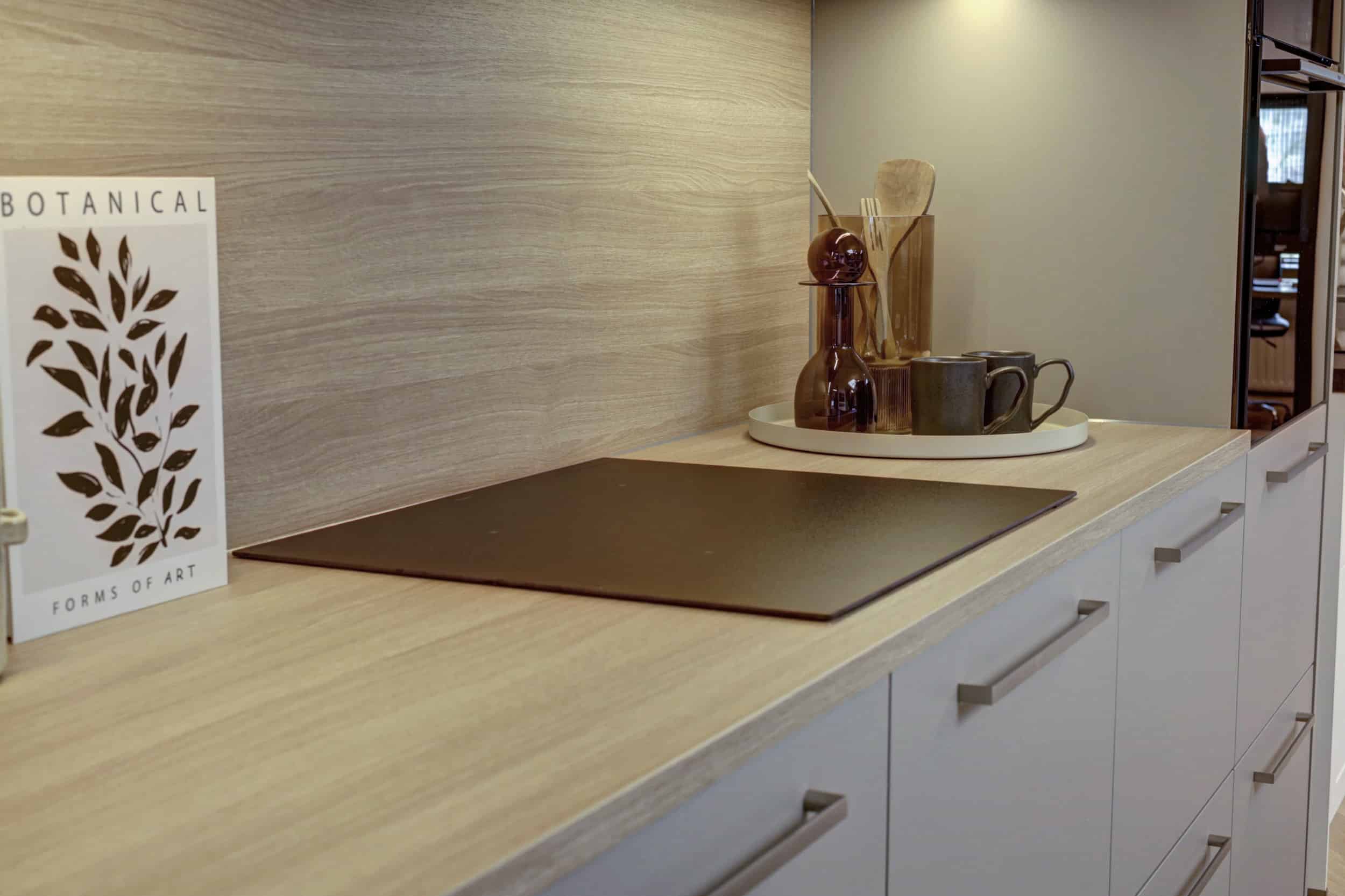Deze keuken oogt rustig en warm tegelijk. De fronten zijn uitgevoerd in de kleur Lava van Nolte. Het blad is ook van Nolte in te kleur natuureik. Het mooie hier is dat het blad ook is doorgezet op de achterwand. Dit zorgt ervoor dat het een geheel wordt en daarnaast is dit erg parktisch qua onderhoud.