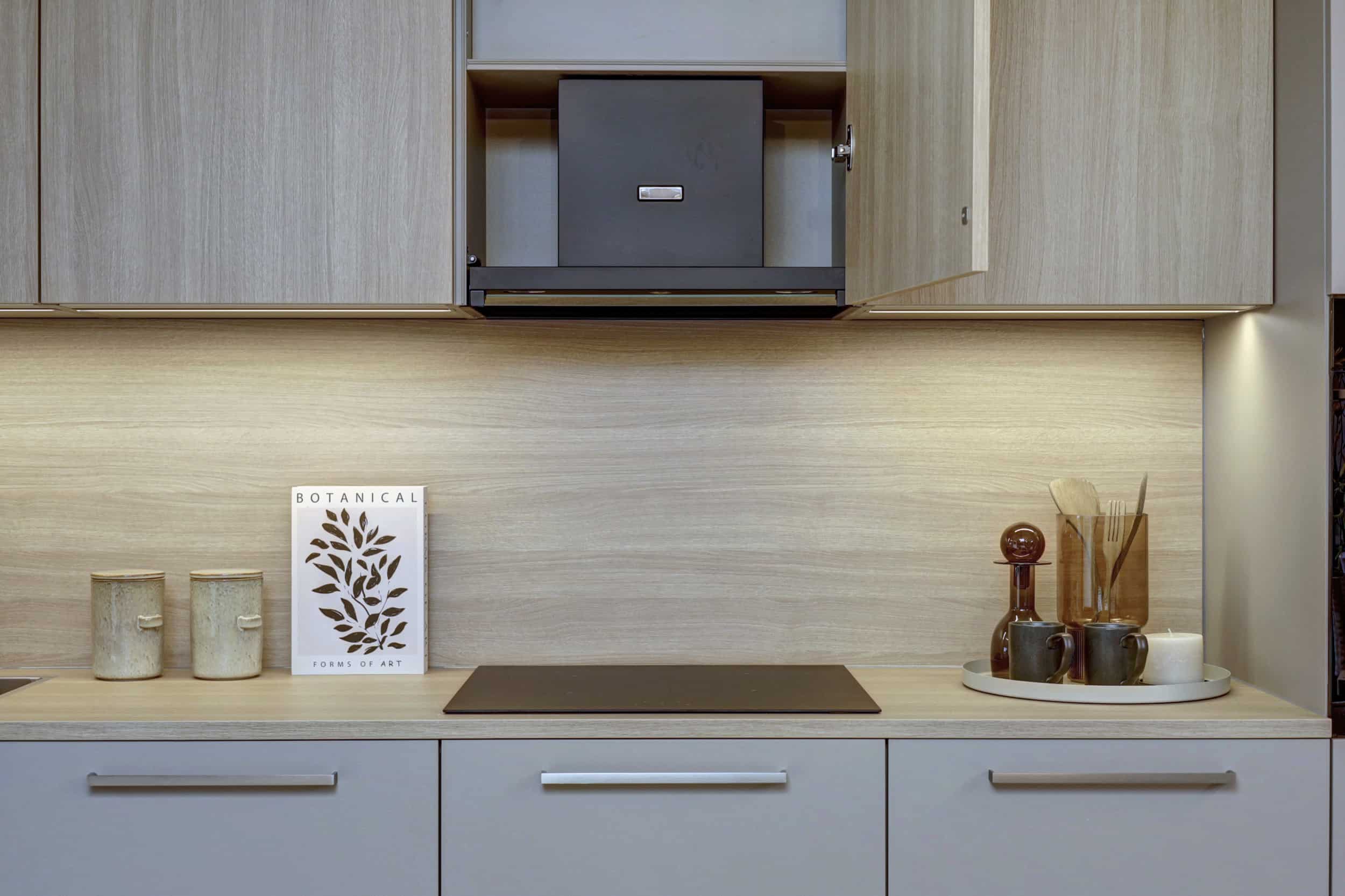 De keuken is uitgevoerd met Pelgrim apparatuur, waaronder een inbouw afzuigkap die op een slimme manier in een bovenkast is verwerkt. Zo blijft de uitstraling rustig zonder onderbreking.