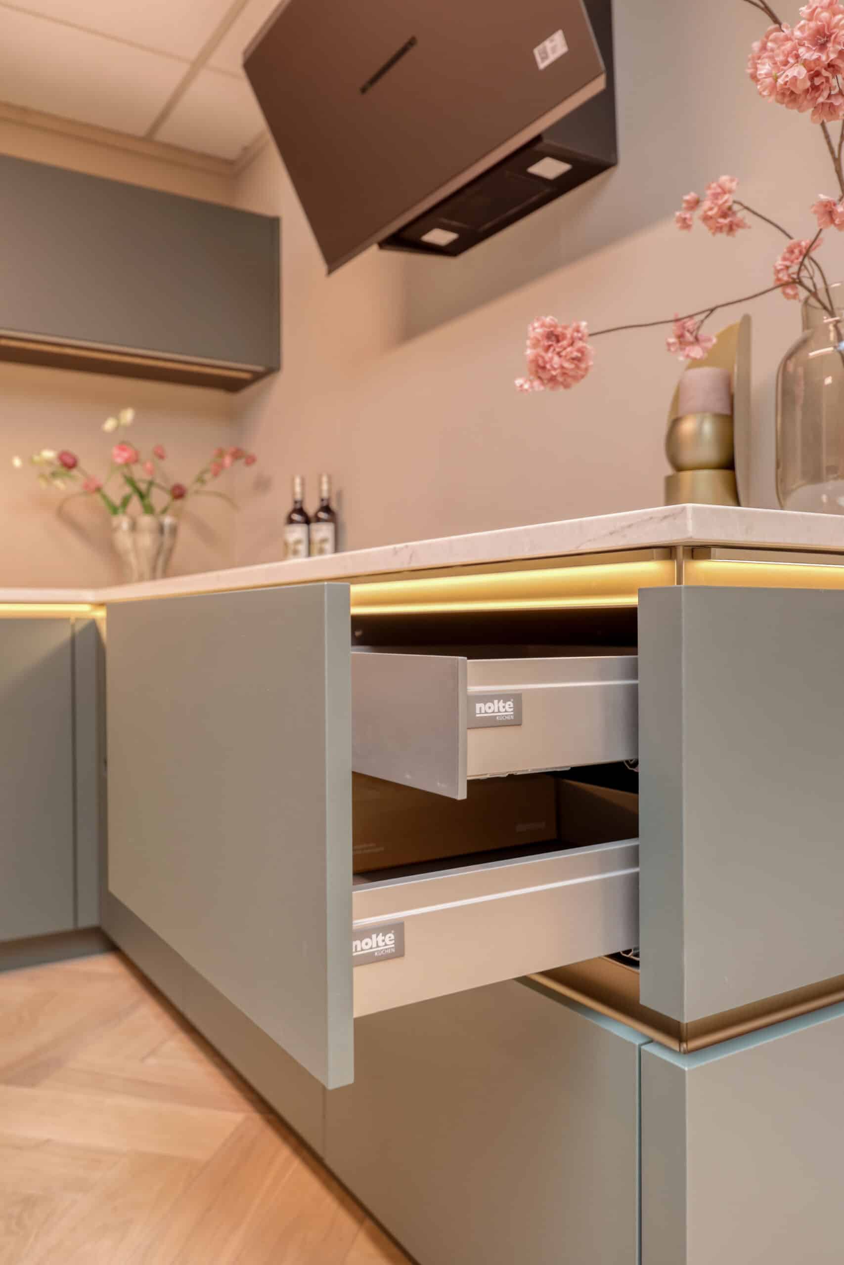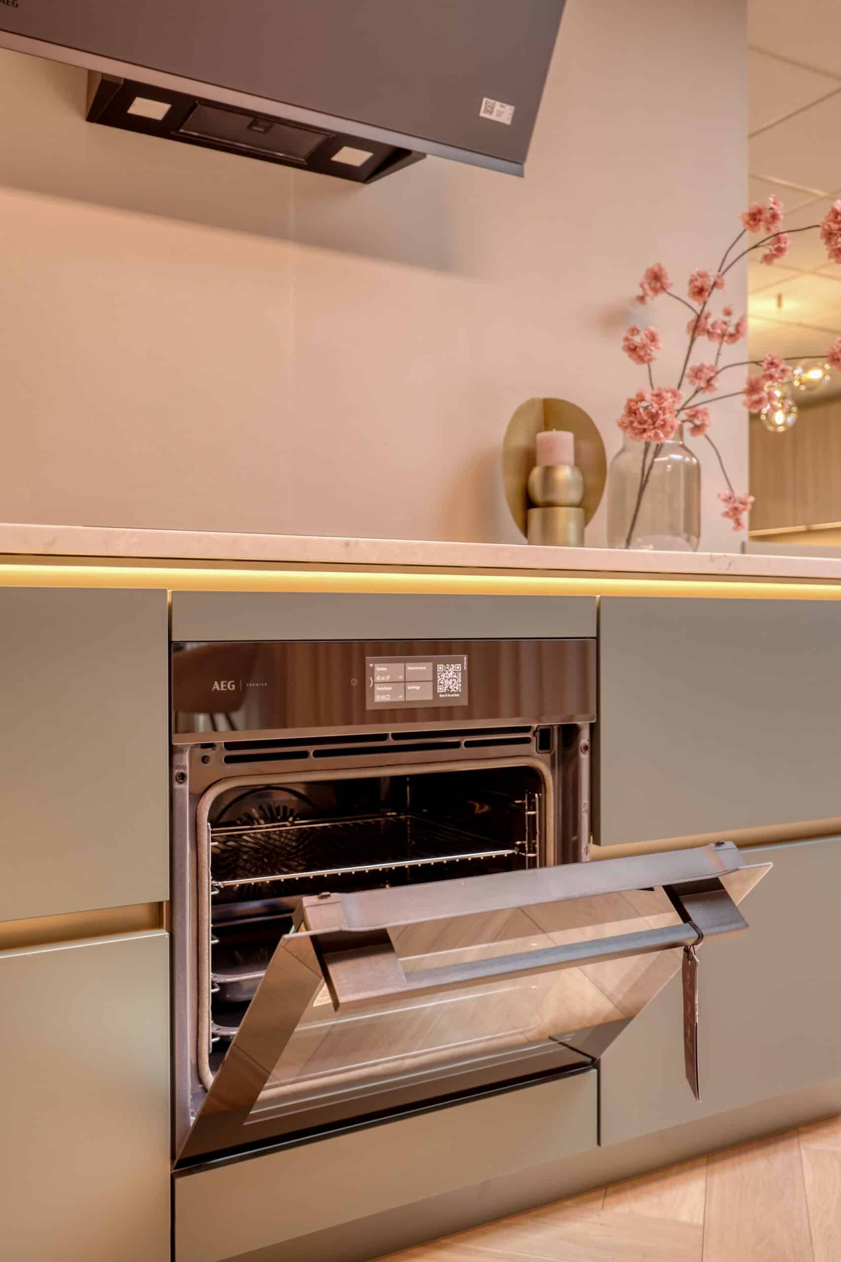 Deze keuken is uitgevoerd in Nolte Black Green. Een anti-finger coating zorgt naast praktisch gemak, ook voor een softmatte en stoere uitstraling. Het blad is uitgevoerd in composiet Asura van Jetstone. De apparatuur is van AEG en vooral de zwarte accenten vallen hier op. Door gebruik te maken van slimme verlichting in de greeplijsten komen de strakke lijnen mooi uit. Ook zorgt de verlichting in de greeplijsten voor sfeer in de keuken.