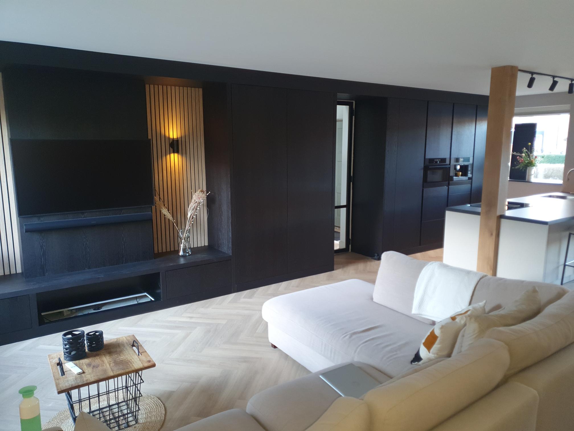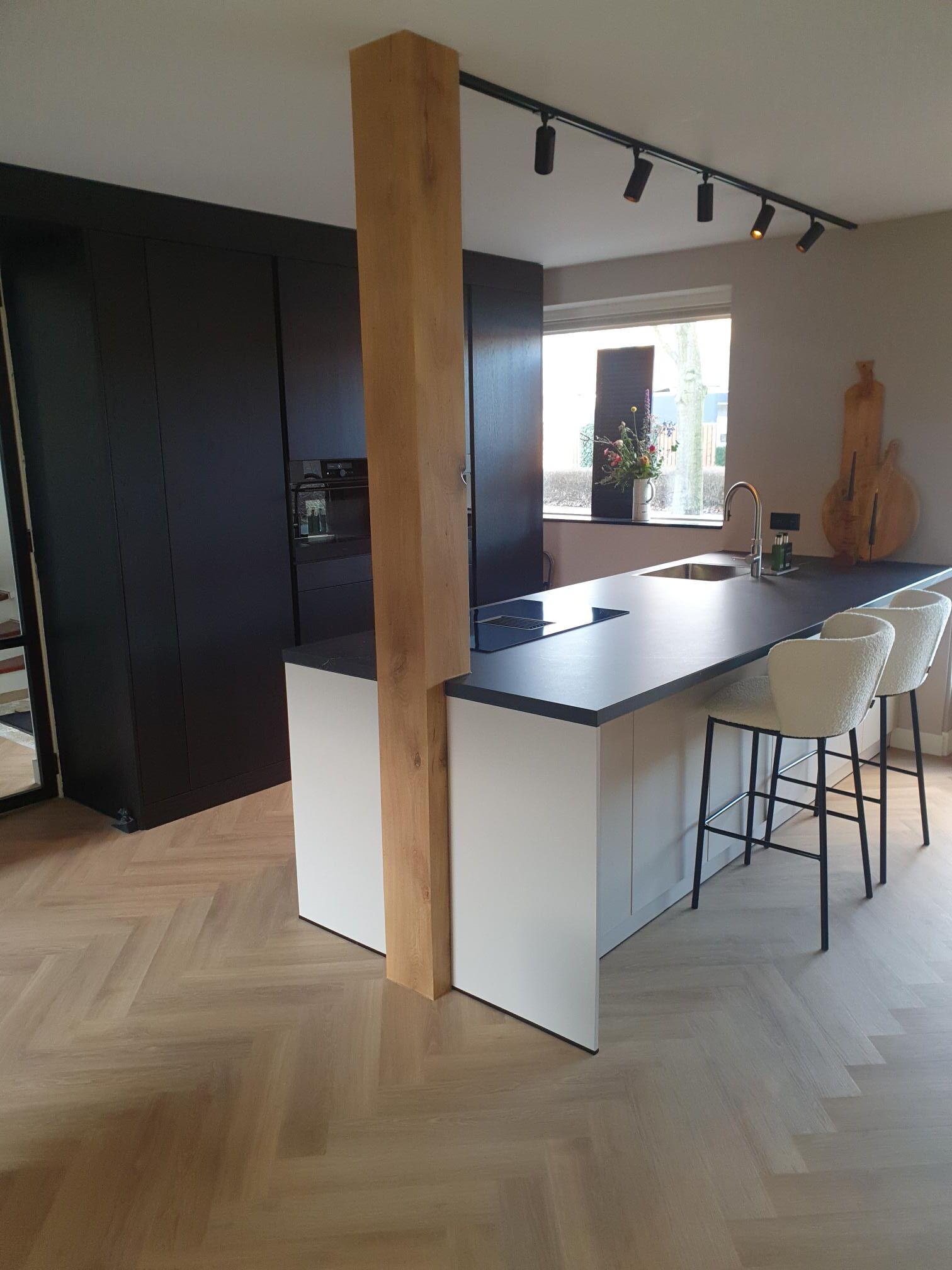 Ook deze prachtige keuken betreft een samenwerking met een meubelmaker. In dit geval ‘loopt’ de hoge kastenwand door tot in de huiskamer waardoor het tv-meubel wordt geïntegreerd in de keuken. De steunpaal in het eiland is fraai bekleed met houten panelen waardoor het samenkomt in één geheel. Ook de PVC vloer in visgraatpatroon is geleverd door Woonstudio Joy en is weer een uitstekende aanvulling op het totaalplaatje!